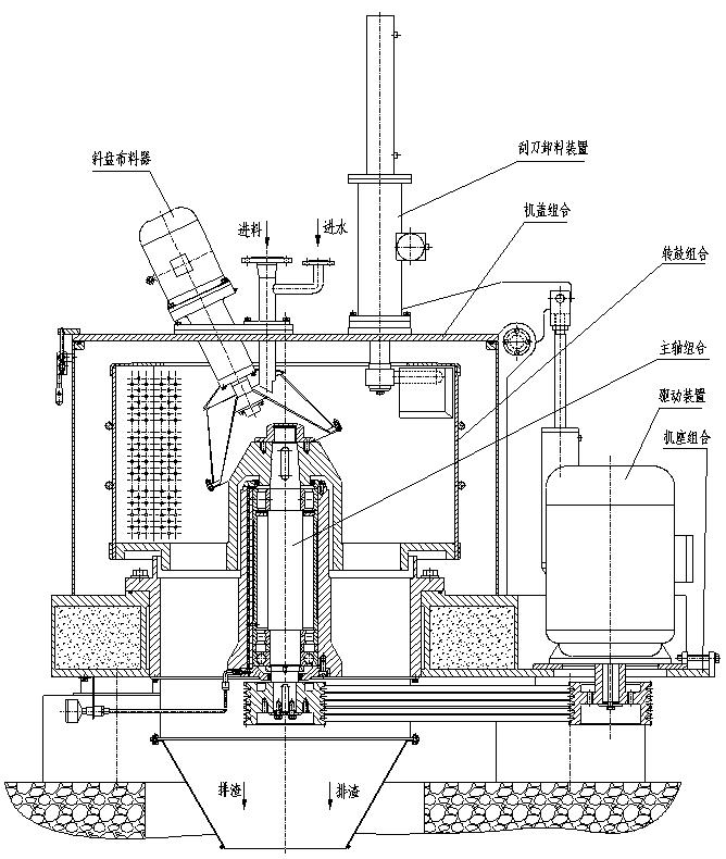 型離心機(jī)是依照制藥裝備GMP規(guī)范設(shè)計制造的新機(jī)型。電動機(jī)帶動轉(zhuǎn)鼓旋轉(zhuǎn),在進(jìn)料轉(zhuǎn)速時,物料由進(jìn)料管引入轉(zhuǎn)鼓。進(jìn)料達(dá)到預(yù)定容積后停止進(jìn)料,升至高速分離,此時可進(jìn)行洗滌。進(jìn)料和高速分離過程中,在離心力作用下,液相物穿過濾布和轉(zhuǎn)鼓壁濾孔排出轉(zhuǎn)鼓,經(jīng)排液管排出機(jī)外,固相物截留在轉(zhuǎn)鼓內(nèi),分離完畢轉(zhuǎn)速至卸料轉(zhuǎn)速狀態(tài),刮刀自動升降、旋轉(zhuǎn)往復(fù)運(yùn)動,將固相物從轉(zhuǎn)鼓壁刮下,從離心機(jī)下部排出。